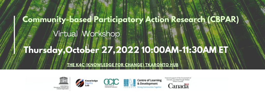The Knowledge Equity Lab (KEL), the Toronto Centre for Community Learning & Development (CL&D), and the Ontario Council for International Cooperation (OCIC) invite you to a virtual workshop introducing Community-based Participatory Action Research (CBPAR).