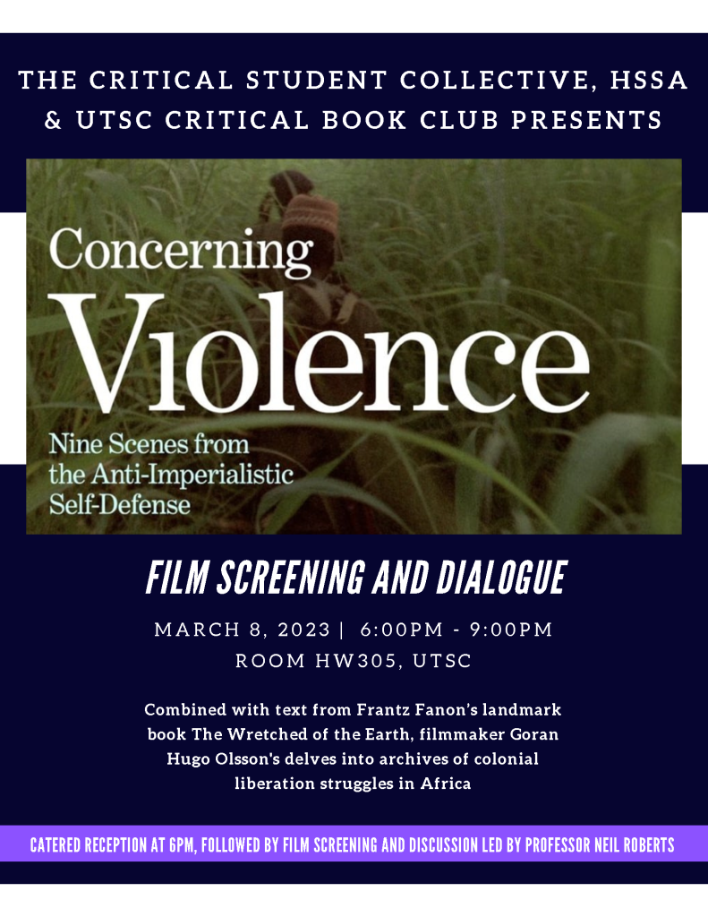 Join the Critical Student Collective, HSSA, and UTSC Critical Book Club for a screening of Göran Hugo Olsson’s film Concerning Violence, followed by a critical dialogue led by Professor Neil Roberts from the Political Science Department at the University of Toronto Scarborough.
