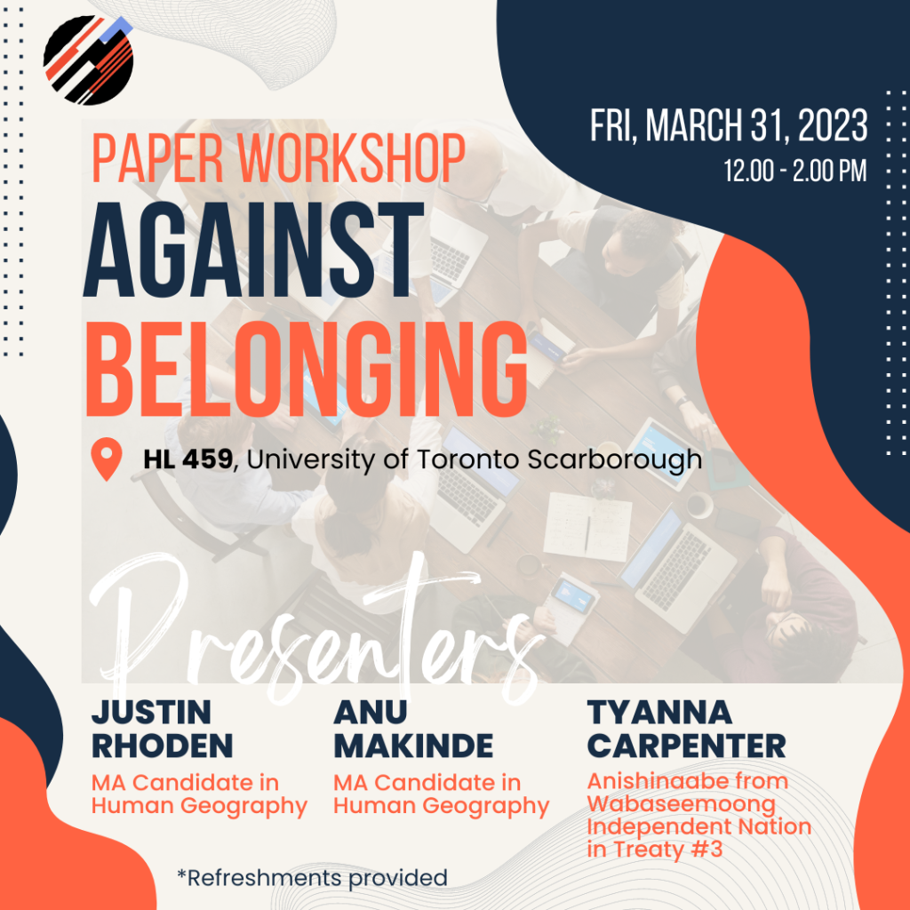 This Friday, Justin, Anu, and Tyanna will present their working paper in “Against Belonging: A Paper Workshop.” Their presentation will be followed by a roundtable discussion centered on constructive criticism to strengthen the paper.