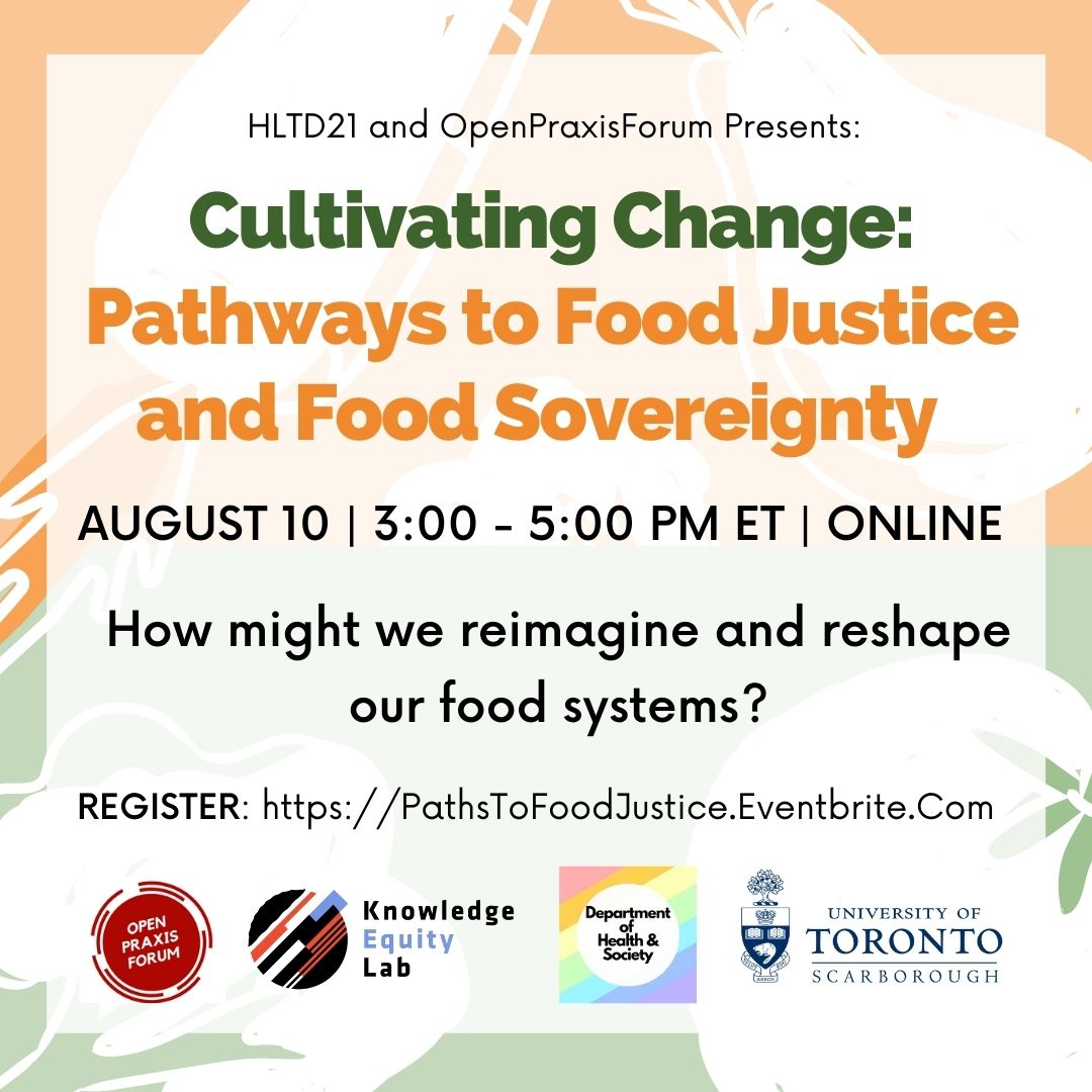The Open Praxis Forum In collaboration with HLTD21 (Food Systems, Food Security, & Health) students at the University of Toronto Scarborough hosted a symposium on August 10th, 2021 to showcase students’ digital projects, featuring actions for building healthy, just, and culturally relevant food systems. Initiatives such as urban rooftop agriculture, and school food programs were highlighted, exploring the key question: How might we reimagine and reshape our food systems?